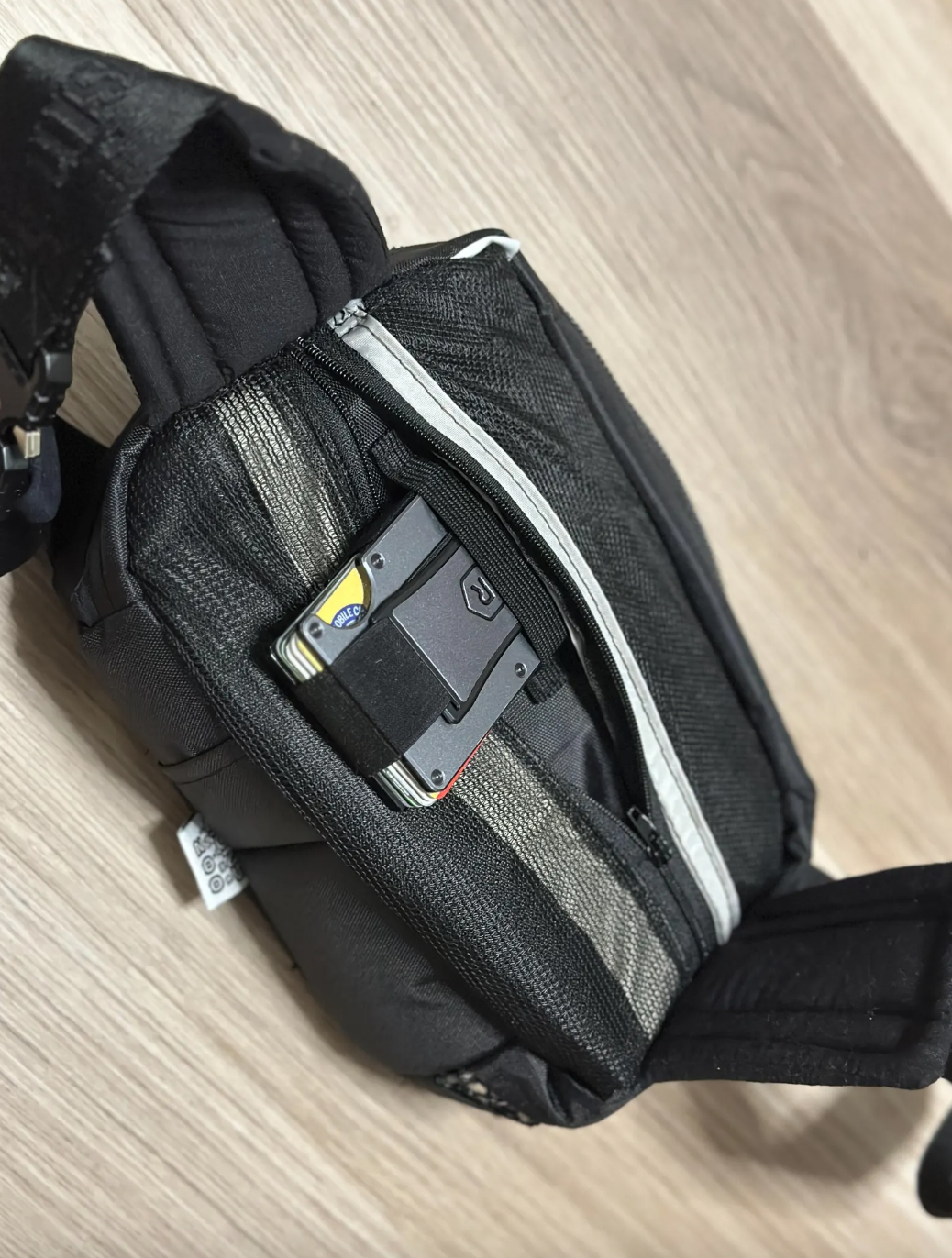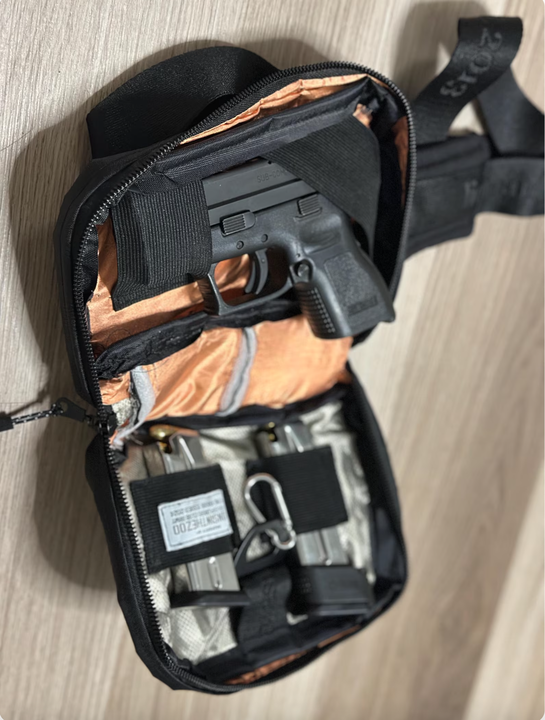 Other compartments. The front zipper pocket is flat and can store miscellaneous items. Inner pocket with net allows visable items to be stored and has a ridge wallet holder. Main compartment has a gun holder, magazine holder and keychain clip.