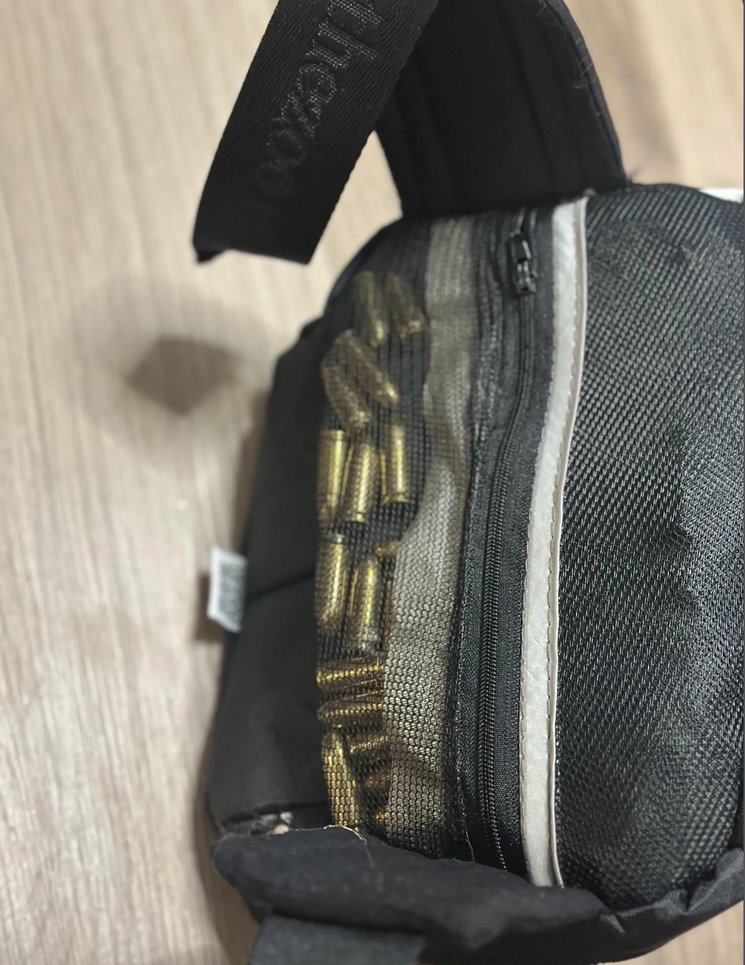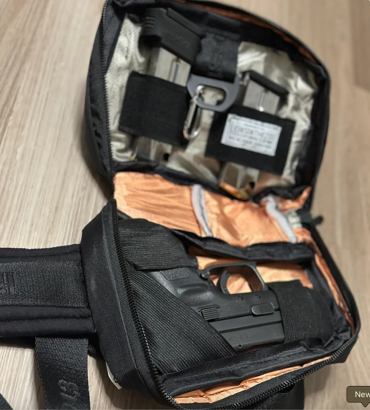 This bag firmly holds a standard handgun in place on compartment that sits against your body. The size of the bag is 8.5” wide x 6.5” height and 3” thickness. We aim to get each back to this size but since they are made by hand individually please allow up to inch and a half deviation. We also allow customization but must contact us first. This bag also has 2 standard magazine holders.